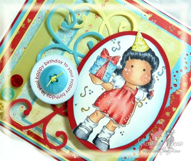 I used the current sketch from Just Magnolia/Hanglar Challenge for my layout. I used my oval nesties for my image’s mat shapes cutting around her feet and hat so they stick out a bit. The swirls are from Marianne Designs and I liked that they kind of emulate the confetti swirls in the image. The round sentiment is from PTI and I put a fun button tied with Scrappers Floss in the center. A ribbon and some smaller buttons finish it off nicely.