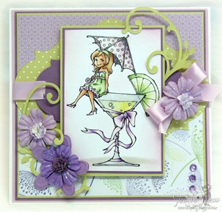 I chose this cutie called “Cocktail Emily” as I thought she was perfect for summertime fun! I have a friend (ahem…ahem) who loves purple so this card may end up at her doorstep if I remember to mail it (I am notoriously horrible at sending stuff, lol). I chose these beautiful SEI papers for the color scheme of lilac, spring green and pale yellows. The swirls are made with Marianne Designs dies and then I added some layered Prima flowers/roses. I added some Stickles to the flowers so they would be sparkly too. The mats behind the image are from SB’s dies Labels 20 Mega Nesties. Some blingy rhinestones and a bow finish this cutie off!
