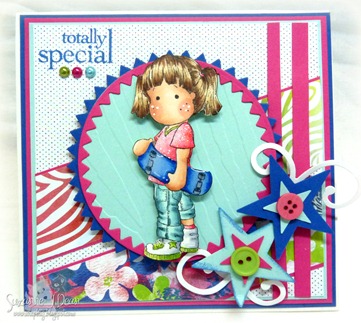 Golly Suzanne, this is so totally adorable.. This little cutie does apply to you as you need a skateboard for as much running around that you do.. Love your different pp and your accessories.. the buttons on the stars are so adorable and so colorful.. the whole card is colorful and a happy card...