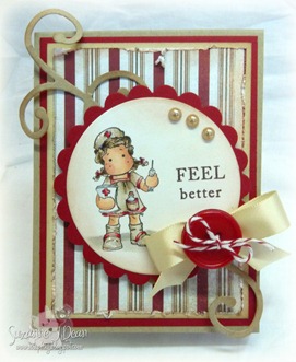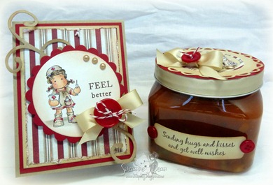 Then to go along with it I have a jar of soup (nope not homemade sorry, I was too tired to do that LOL). I used my Spellbinders again to cut mats out for the jar top and then added cute Mini Dr. Edwin from Magnolia-licious (he comes in regular size too). The sentiment on the tag on the front is from Gina K and I anchored it with matching red buttons. Just a fun Feel Better Set for someone who’s not feeling so good and cheer them up a bit!